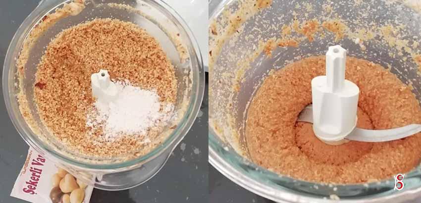 Fındıklar, şeker, yağ ve vanilya robota koyup 9-10 dakika kadar çekilir. Kaşık yardımıyla yukarı çıkan fındık parçacıkları aşağıya itilip iyice çekilir. Karışım bir kaba alınır.